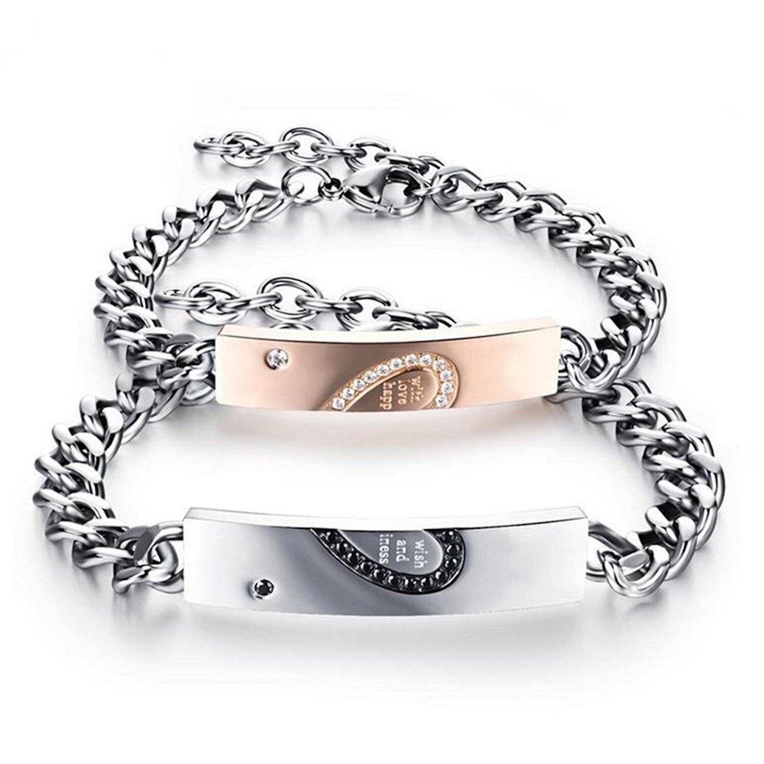 カップル用、プレート付のブレスレットペアセットです。プレートにハートマーク(ブラック&ピンクゴールド)と「with wish love and happiness」を刻印されていて品のあるデザインです。上質のキュービックジルコニアを配置することでより美しく輝きます。カップル、恋人、大切な人とのお揃いができるオシャレなアイテム。