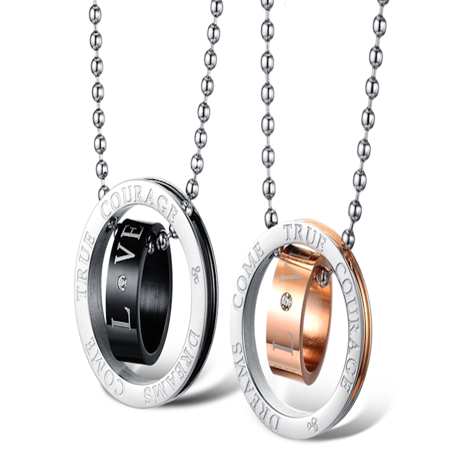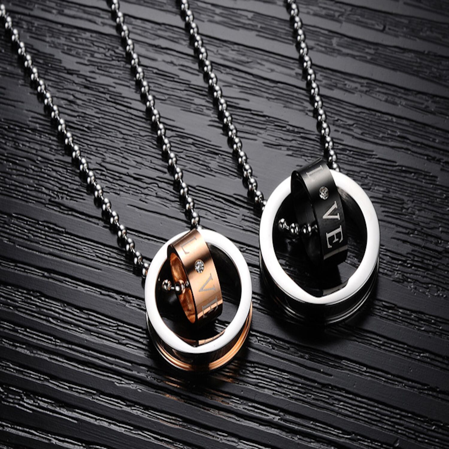 【☆ペアアクセサリー工房☆】ペアルック ペアネックレス シルバー 刻印 LOVE キュービックジルコニア ブラック&ゴールド メンズ+レディース2点セット ジュエリーポーチ付き