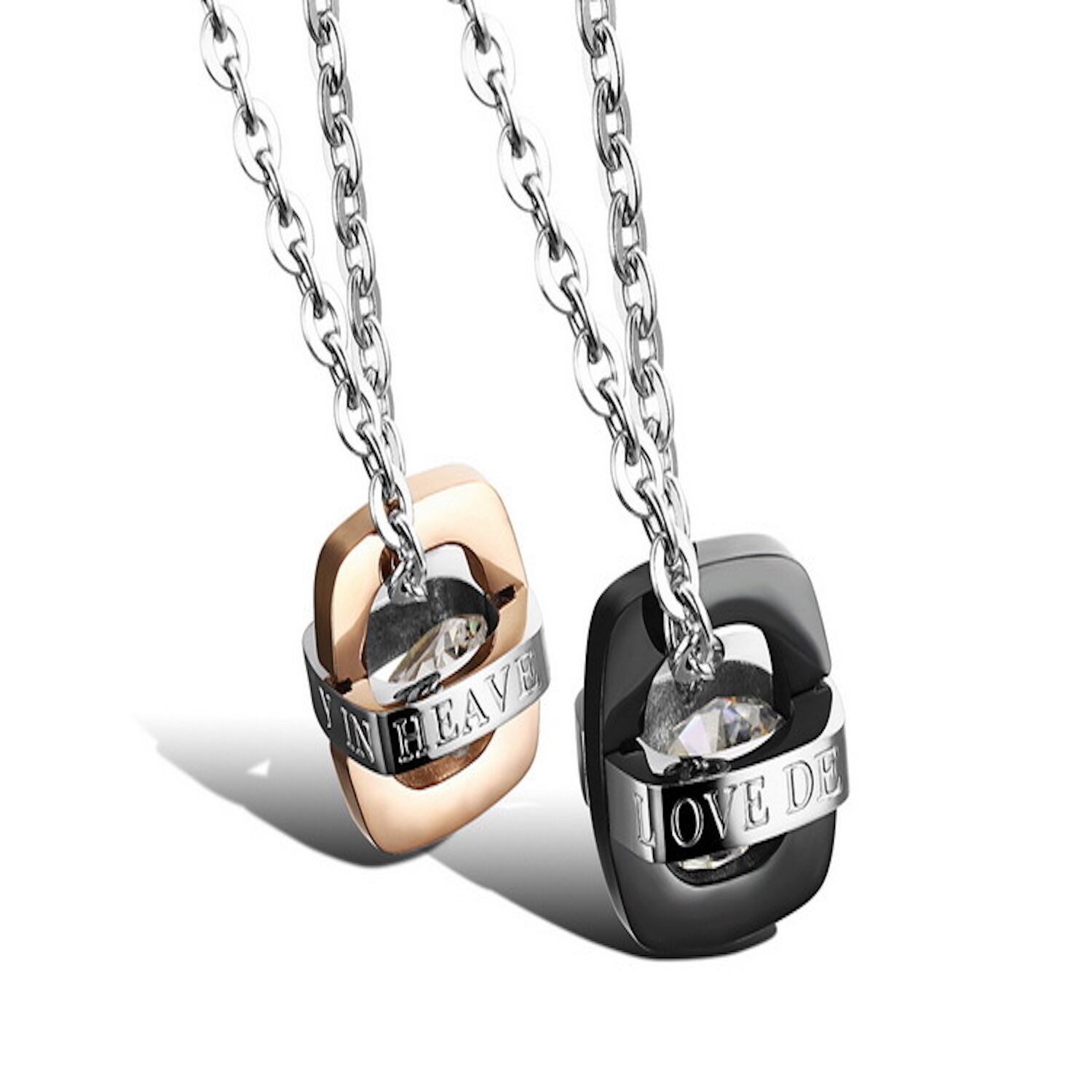 【正規品】【☆ペアアクセサリー工房☆】【2個セット】ペアルック ペアネックレス シルバー 刻印 「LOVE DEEPLY IN HEAVEN」キュービックジルコニア ブラック&ゴールド メンズ+レディース2点セット ジュエリーポーチ付き