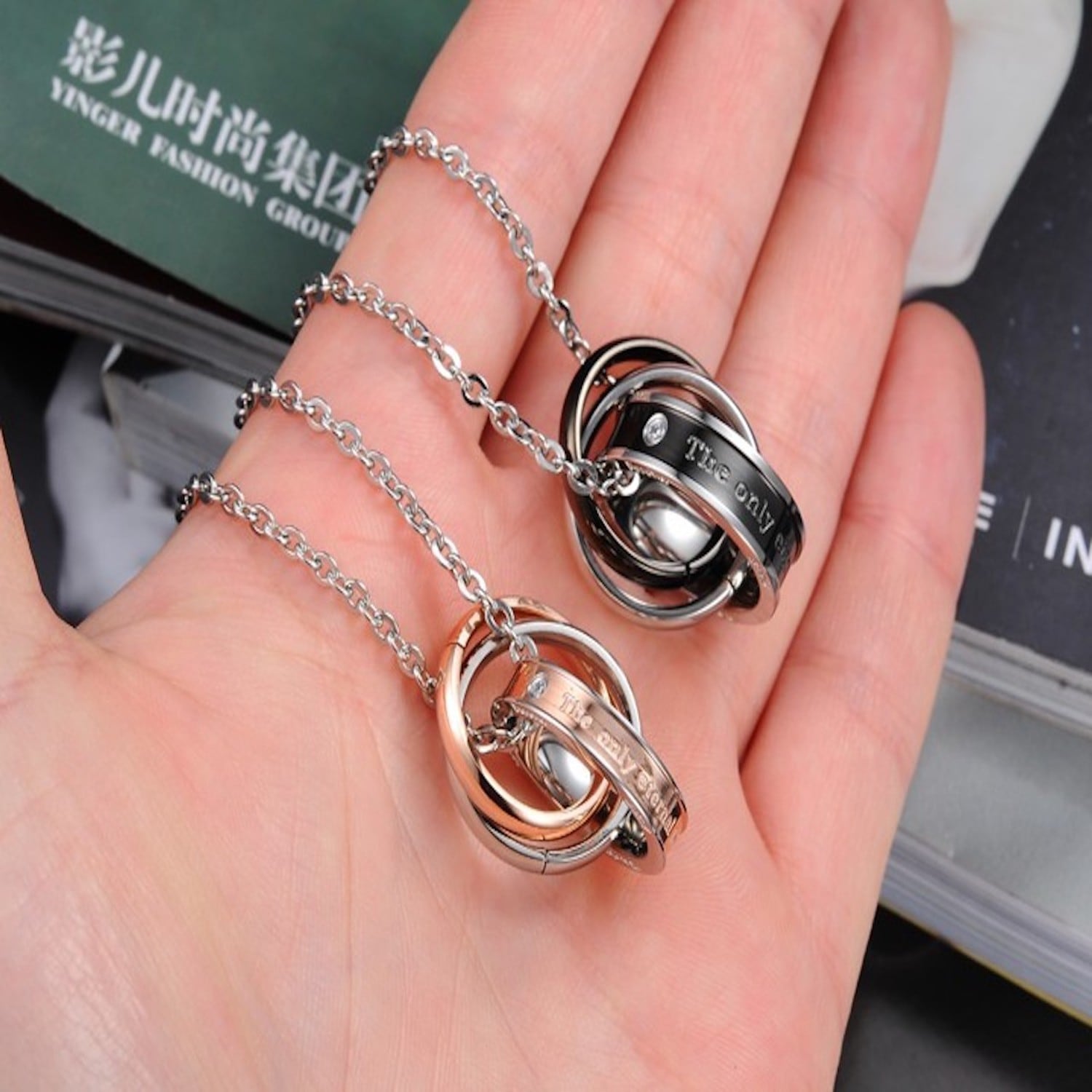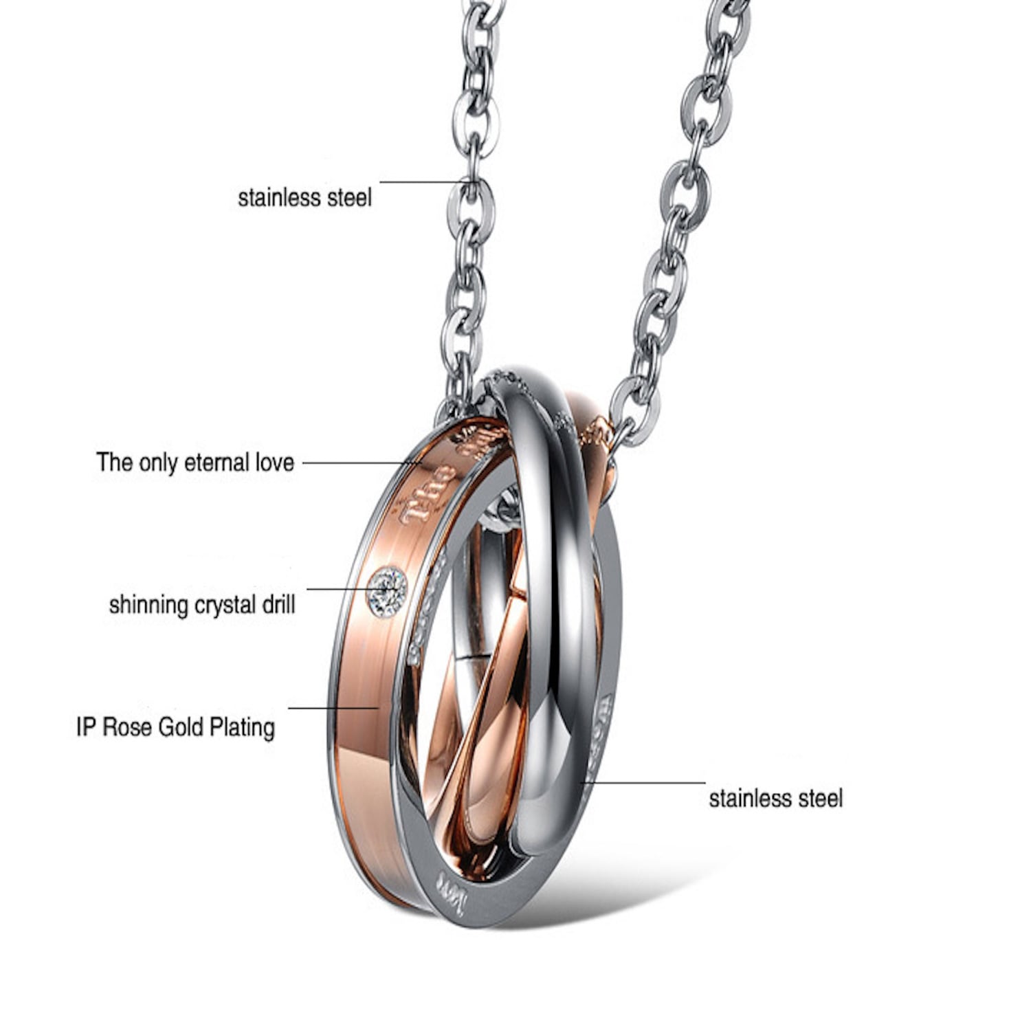 プレゼントに最適なペアネックレスセット。「The only eternal love」(和訳:唯一の永遠の愛)の刻印を施したシンプルで上品なネックレス。